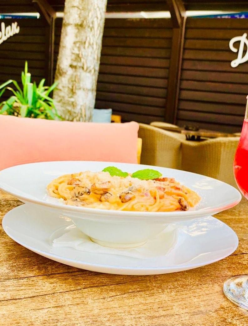 (spaghetti/ penne, bacon, smantana, sos rosii, ciuperci, usturoi, parmesan)
